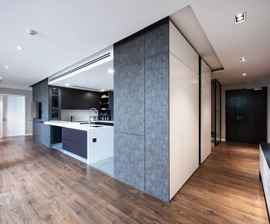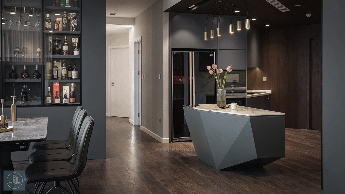 So với phòng khách, cường độ sử dụng của khu bếp có thể ít hơn tuy nhiên đây lại là nơi cả gia đình quây quần bên mâm cơm sau thời gian làm việc căng thẳng. Sàn gỗ công nghiệp tạo sự ấm cúng cho không gian. Bên cạnh đó, tính chất của gỗ giúp điều hòa không khí, tinh thần thư giãn.
